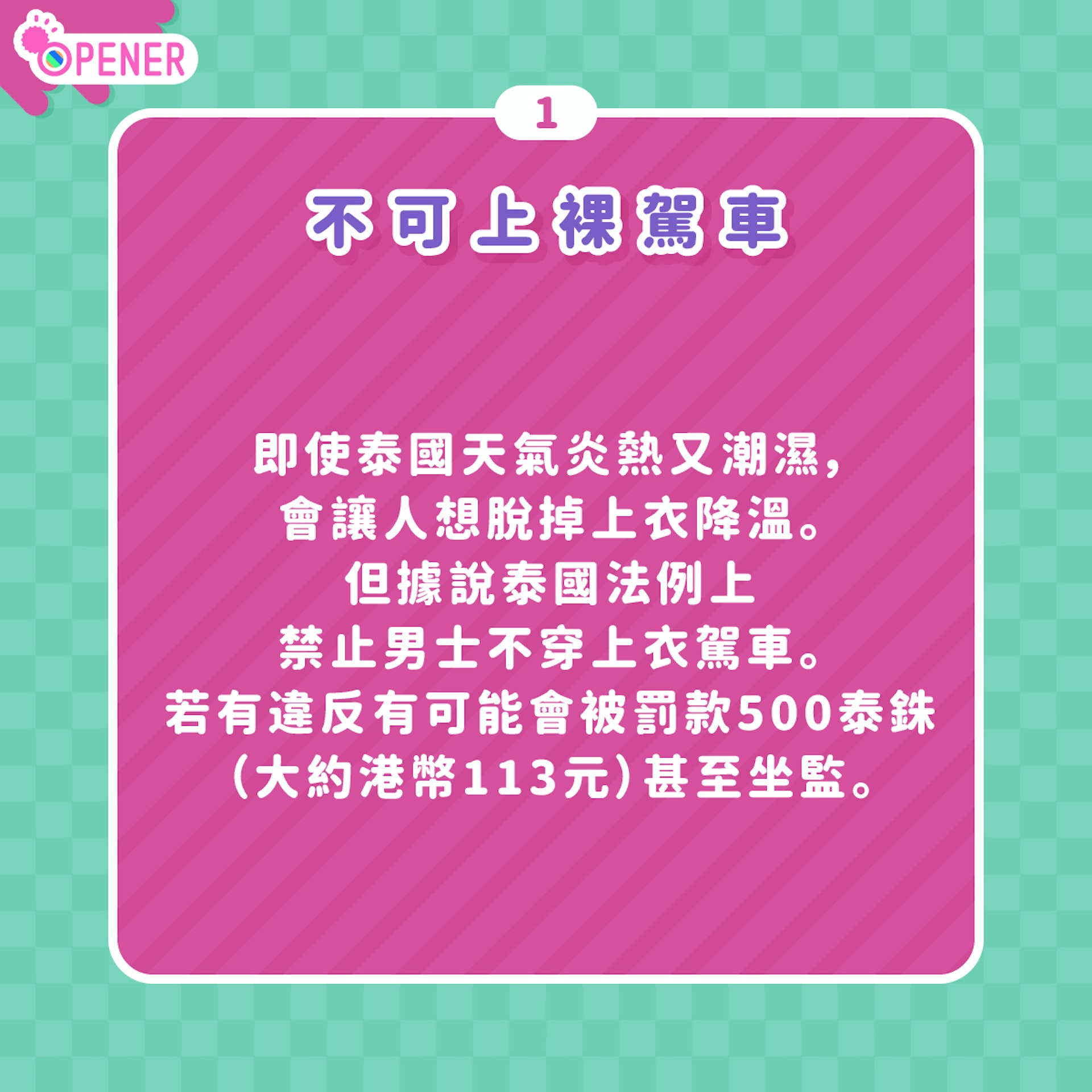 即使泰國天氣炎熱又潮濕,會讓人想脫掉上衣降溫。但據說泰國法例上禁止男士不穿上衣駕車。若有違反有可能會被罰款500泰銖(大約港幣113元)甚至坐監。
