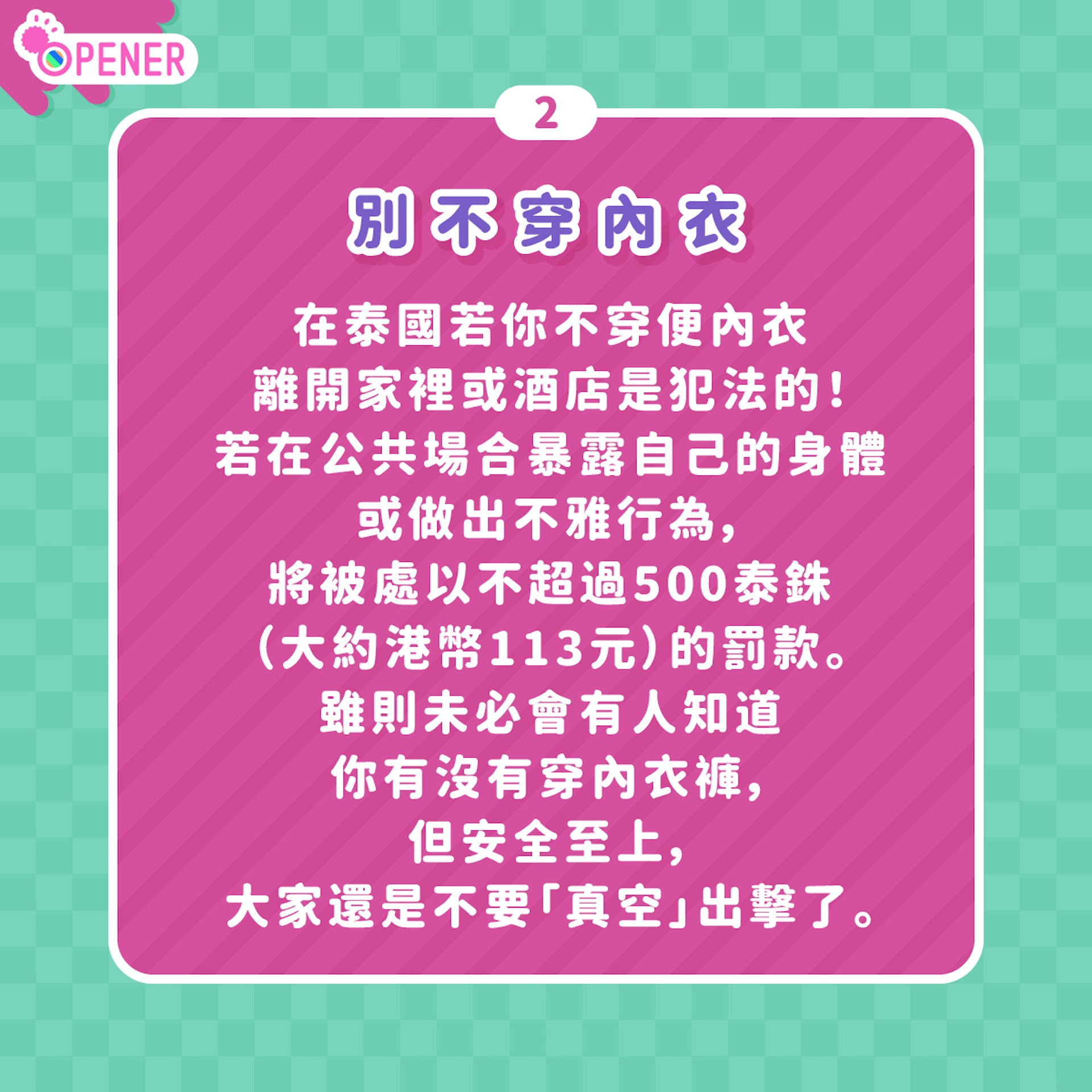 在泰國若你不穿便內衣離開家裡或酒店是犯法的!若在公共場合暴露自己的身體或做出不雅行為,將被處以不超過 500 泰銖(大約港幣113元)的罰款。雖則未必會有人知道你有沒有穿內衣褲,但安全至上,大家還是不要「真空」出擊了。