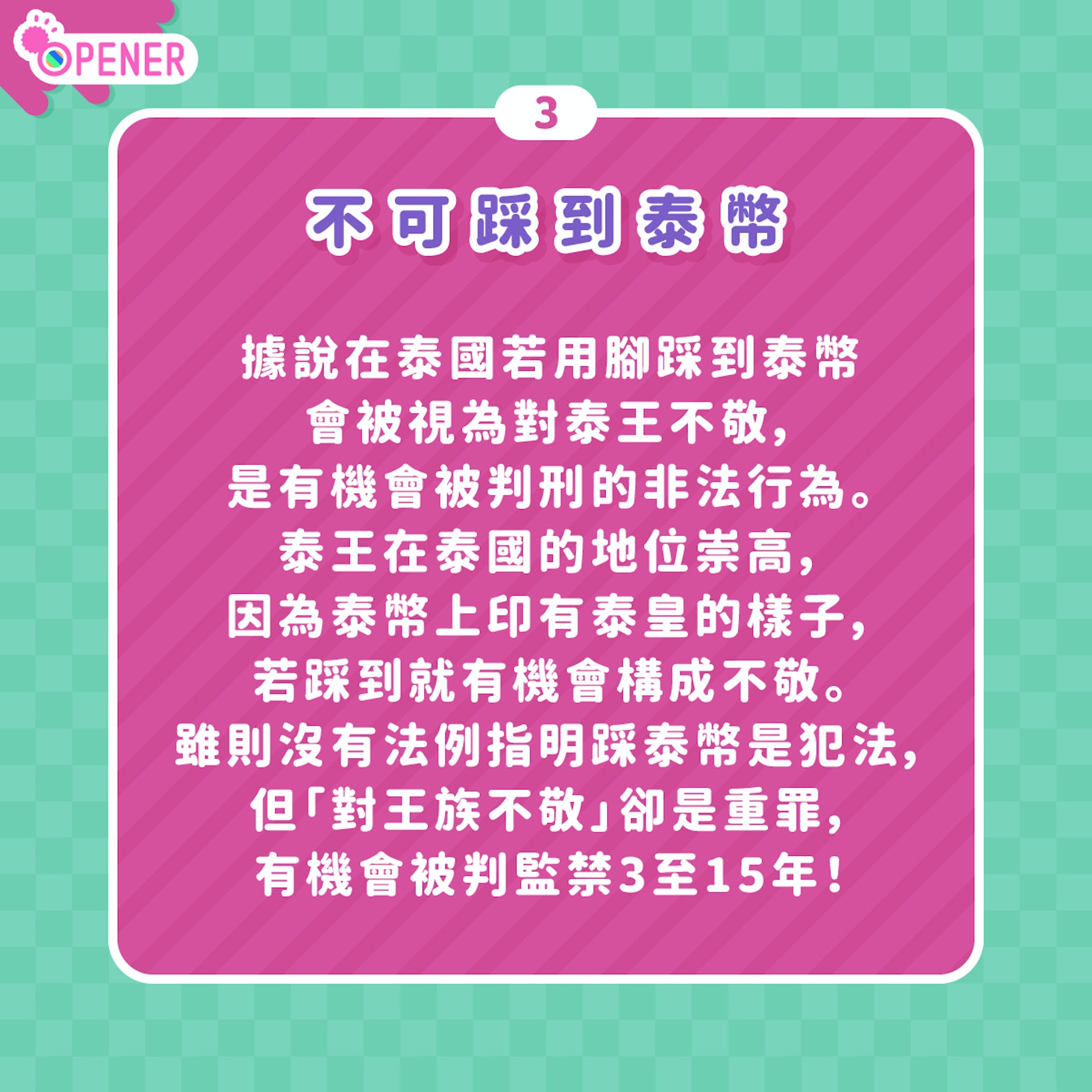 據說在泰國若用腳踩到泰幣會被視為對泰王不敬,是有機會被判刑的非法行為。泰王在泰國的地位崇高,因為泰幣上印有泰皇的樣子,若踩到就有機會構成不敬。雖則沒有法例指明踩泰幣是犯法,但「對王族不敬」卻是重罪,有機會被判監禁3至15年!