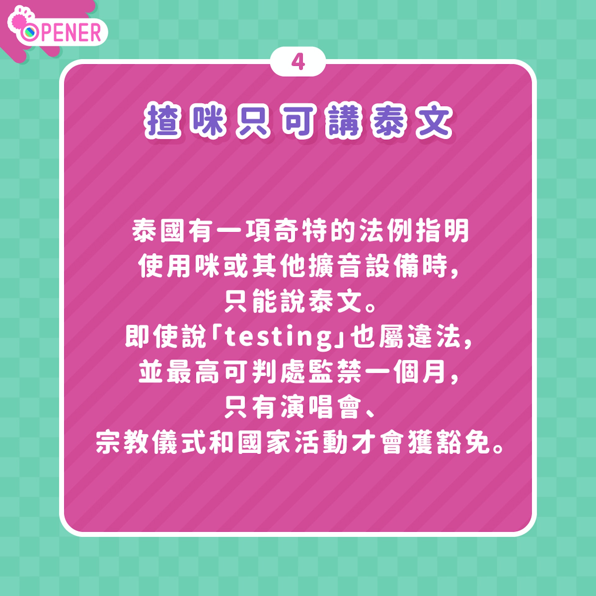 泰國有一項奇特的法例指明使用咪或其他擴音設備時,只能說泰文。即使說「testing」也屬違法,並最高可判處監禁一個月,只有演唱會、宗教儀式和國家活動才會獲豁免。